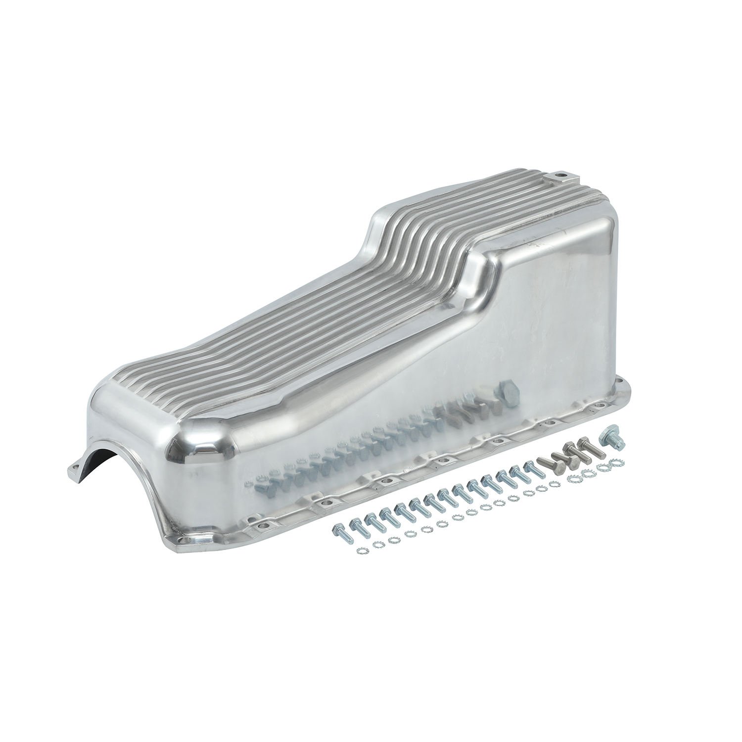 > For a polished finned aluminum oil pan for small block Chevy. Fits 1955-1979 2 piece rear main – 283, 302, 305, 327, and 350’s.