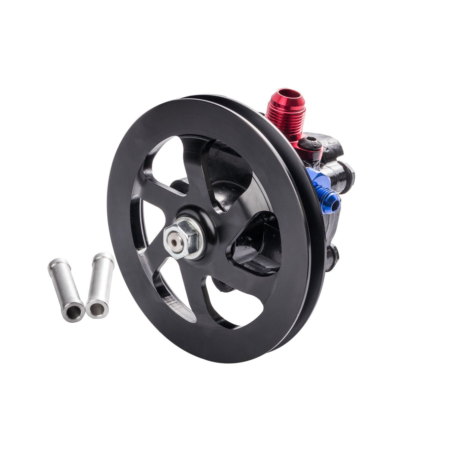 Power Steering Pump is powder coated in black, while pulley anodized in black;